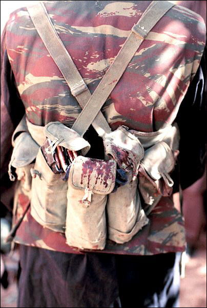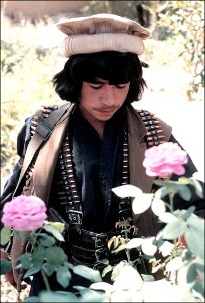 Kabul Suburb 1988-In a courtyard on the outskirts of Kabul, a mujahed doctor implored me to take a picture of the boy on the left. "He is beautiful, is he not?" I didn't answer him. I wondered who had so lovingly equipped him with bandoliers more suited to 19th century warfare. Was it his parents? I was too tired to ask or respond. Nearby, a solemn veteran waited with us. The picture on the right is of his blood-soaked bandolier. I didn't have to wonder much where his bandolier came from. There were warning signs everywhere. They hinted at things to come unless other options for the course of events were introduced. Surely the U.S. who had so eagerly supported the Mujahedin would help rebuild a civil society as they had in defeated Nazi Germany, liberated France and later in the Balkans. It was not to be. An incredibly short-sighted and self-serving American diplomacy turned its back on Afghanistan. The bright romantic dreams of holy war for independence and revolution gave way to civil war, stalemate and their attendant horrors. The vanities of the Afghan warrior pride and culture were corroded down to simple deadly pragmatism. You had to be thick not to see it coming. |