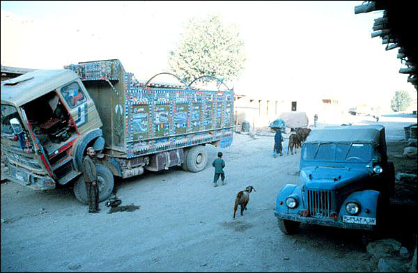 Truckstop and Teahouse, Logar 1988- Throughout the war, heavy trucks like this one lumbered across Afghanistan. Bedfords, Hinos, Mercedes all carried goods through battlefronts and borders delivering everything from weapons to drugs to consumer goods. The "Smugglers Bazaar" in Peshawar was about the size of a Home Depot and sold Soviet consumer goods like refrigerators and stoves, all carried by truck in spite of the war. The Afghan trucking Mafia is a little recognized and powerful player in regional politics. They continue to prop up the Taliban. |